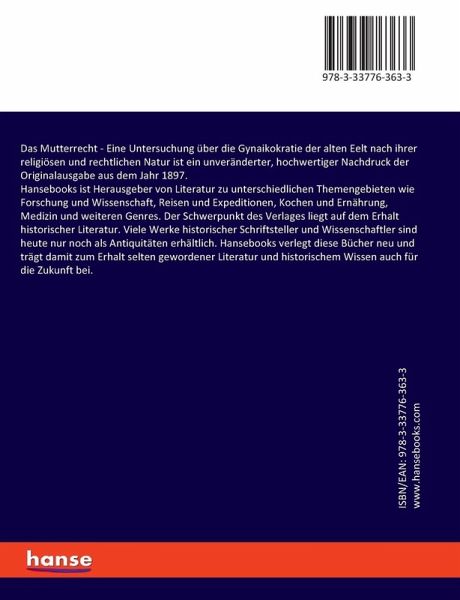 Das Mutterrecht - Eine Untersuchung über die Gynaikokratie der alten Eelt nach ihrer religiösen und rechtlichen Natur ist ein unveränderter, hochwertiger Nachdruck der Originalausgabe aus dem Jahr 1897.