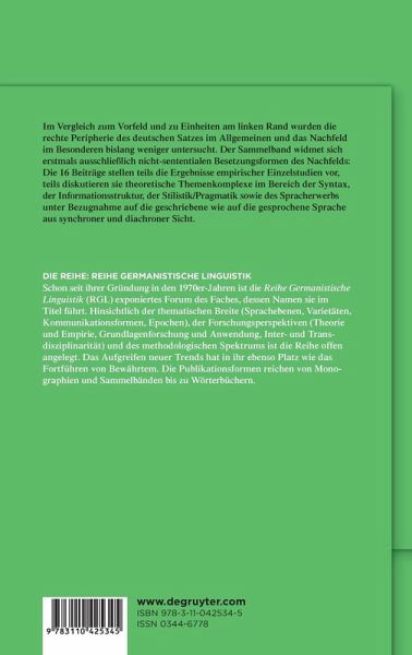 Im Vergleich zum Vorfeld und zu Einheiten am linken Rand wurde die rechte Peripherie des deutschen Satzes bislang wenig untersucht. Der Sammelband widmet sich erstmals ausschließlich nicht-sententialen Besetzungsformen des Nachfelds. Die 16 Beiträge greifen das Thema aus unterschiedlichen methodischen Perspektiven auf, sodass - erstmals in der Nachfeld-Forschung - syntaktisch-funktional, generativ und pragmatisch-stilistisch ausgerichtete Herangehensweisen sowie die Spracherwerbsperspektive zusammentreffen und ihren Fragestellungen unter Berücksichtigung sprachhistorischer sowie modern-synchroner Aspekte nachgehen. Die Studien, die sich dem Spannungsfeld zwischen grammatisch-strukturellen, gesprochensprachlichen, diskursfunktionalen und varietätenspezifischen Merkmalen des Nachfelds widmen, lassen dieses Stellungsfeld im Ergebnis als eine ebenso wesentliche und relevante Position erscheinen wie das bereits in vielfacher Hinsicht gut untersuchte Vorfeld bzw. den linken Satzrand. Der Band zeigt damit, wie facettenreich das Funktionsspektrum des Nachfelds im Deutschen ist, und bietet zugleich Impulse für die künftige Forschung in diesem Bereich.