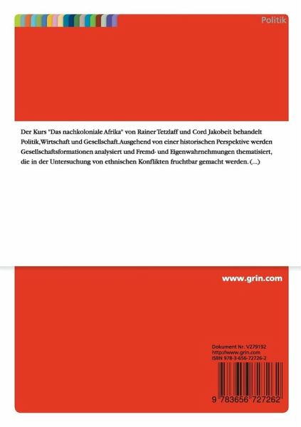 Zusammenfassung aus dem Jahr 2012 im Fachbereich Politik - Internationale Politik - Region: Afrika, FernUniversität Hagen, Veranstaltung: Modul 2.2 - Regieren jenseits etablierter Demokratien, Sprache: Deutsch, Abstract: Der Kurs "Das nachkoloniale Afrika" von Rainer Tetzlaff und Cord Jakobeit behandelt Politik, Wirtschaft und Gesellschaft. Ausgehend von einer historischen Perspektive werdenGesellschaftsformationen analysiert und Fremd- und Eigenwahrnehmungen thematisiert, die in der Untersuchung von ethnischen Konflikten fruchtbar gemacht werden. Einen zentralen Platz erhält die Analyse von Staat und politischer Herrschaft sowie von Demokratisierungsprozessen, die zugleich die Schwierigkeiten und Rückschläge auf diesem Gebiet beleuchten. Untersucht werden dabei die Problematik der Staatsbildung und die personale Dimension politischer Herrschaft. Die Situation Afrikas ist ohne Einbezug der Außenbeziehungen nicht zu verstehen. Daher werden politische und ökonomische Außenbeziehungen umfassend einbezogen. Abschließend werden Entwicklungsperspektiven diskutiert, in denen die Governance-Möglichkeiten systematisch erörtert werden. Ausführliche Zusammenfassung ohne Literaturangaben.