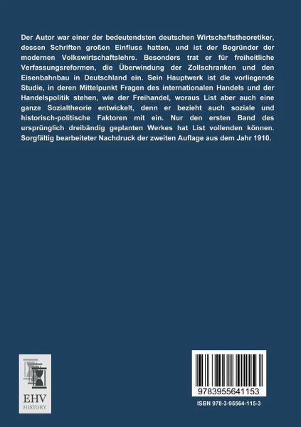 Der Autor war einer der bedeutendsten deutschen Wirtschaftstheoretiker, dessen Schriften großen Einfluss hatten, und ist der Begründer der modernen Volkswirtschaftslehre. Besonders trat er für freiheitliche Verfassungsreformen, die Überwindung der Zollschranken und den Eisenbahnbau in Deutschland ein. Sein Hauptwerk ist die vorliegende Studie, in deren Mittelpunkt Fragen des internationalen Handels und der Handelspolitik stehen, wie der Freihandel, woraus List aber auch eine ganze Sozialtheorie entwickelt, denn er bezieht auch soziale und historisch-politische Faktoren mit ein. Nur den ersten Band des ursprünglich dreibändig geplanten Werkes hat List vollenden können. Sorgfältig bearbeiteter Nachdruck der zweiten Auflage aus dem Jahr 1910.