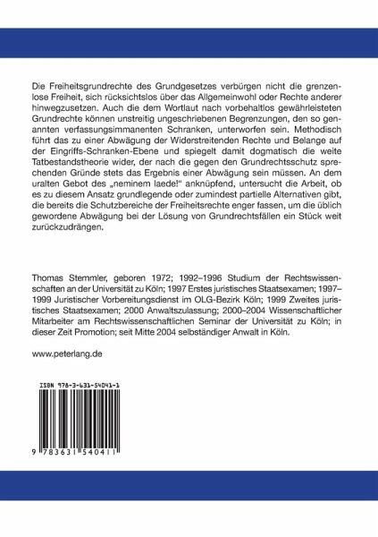 Die Freiheitsgrundrechte des Grundgesetzes verbürgen nicht die grenzenlose Freiheit, sich rücksichtslos über das Allgemeinwohl oder Rechte anderer hinwegzusetzen. Auch die dem Wortlaut nach vorbehaltlos gewährleisteten Grundrechte können unstreitig ungeschriebenen Begrenzungen, den so genannten verfassungsimmanenten Schranken, unterworfen sein. Methodisch führt das zu einer Abwägung der widerstreitenden Rechte und Belange auf der Eingriffs-Schranken-Ebene und spiegelt damit dogmatisch die weite Tatbestandstheorie wider, der nach die gegen den Grundrechtsschutz sprechenden Gründe stets das Ergebnis einer Abwägung sein müssen. An dem uralten Gebot des "neminem laede!" anknüpfend, untersucht die Arbeit, ob es zu diesem Ansatz grundlegende oder zumindest partielle Alternativen gibt, die bereits die Schutzbereiche der Freiheitsrechte enger fassen, um die üblich gewordene Abwägung bei der Lösung von Grundrechtsfällen ein Stück weit zurückzudrängen.
