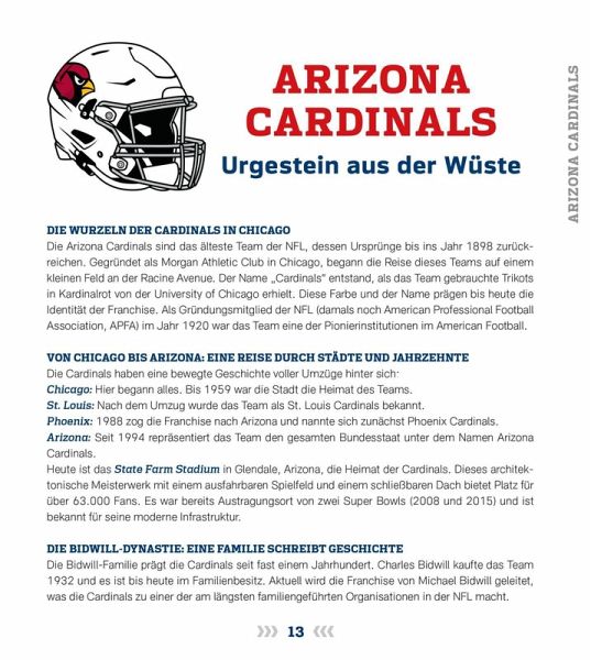 Dieses umfassende Nachschlagewerk präsentiert alle 32 NFL-Teams in alphabetischer Reihenfolge. Mit zahlreichen Bildern, detaillierten Fakten und spannenden Hintergrundinformationen liefert es einen kompakten Überblick über die Geschichte, Erfolge und wichtigsten Daten jeder Mannschaft.