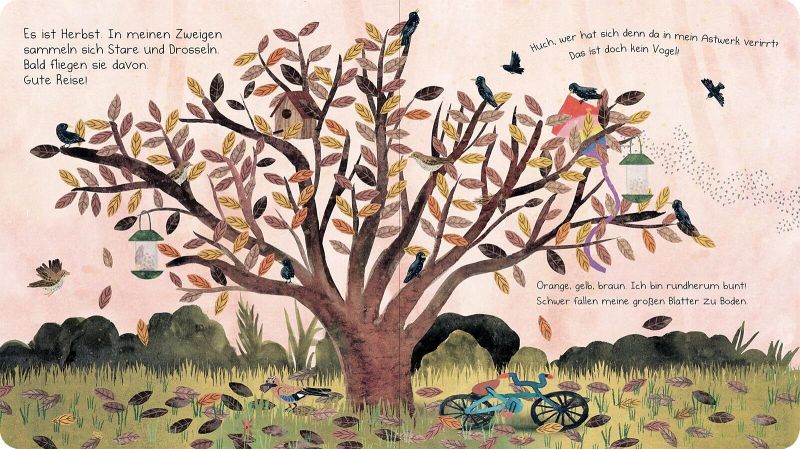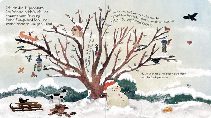 Ich bin der Tulpenbaum. Schau mal, wer mich alles besucht: Rotkehlchen, Meisen, Amseln und sogar ein Eichhörnchen. Im Frühjahr bauen die Stieglitze ihr Nest in meinen Zweigen. Im Sommer spenden meine Blätter Schatten. Im Herbst färbe ich mich bunt und die Zugvögel sammeln sich in meinen Ästen. Im Winter schlafe ich und träume schon vom nächsten Frühling ... Ein poetisches Pappbilderbuch über den Zauber der Jahreszeiten und die kleinen Wunder der Natur.