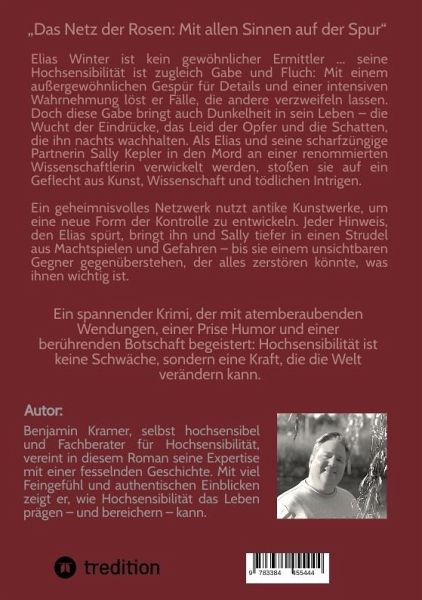 "Das Netz der Rosen: Mit allen Sinnen auf der Spur" -Ein Krimi, der unter die Haut geht - spannend, emotional und einzigartig.Elias Winter ist kein gewöhnlicher Ermittler. Seine Hochsensibilität ist zugleich Gabe und Fluch: Mit einem außergewöhnlichen Gespür für Details und eine unvergleichliche Wahrnehmung löst er Fälle, die andere verzweifeln lassen. Doch diese Gabe bringt auch Dunkelheit in sein Leben - die Wucht der Eindrücke, das Leid der Opfer und die Schatten, die ihn nachts wachhalten. Als Elias und seine scharfzüngige Partnerin Sally Kepler in den Mord an einer renommierten Wissenschaftlerin verwickelt werden, stoßen sie auf ein Geflecht aus Kunst, Wissenschaft und tödlichen Intrigen. Ein geheimnisvolles Netzwerk nutzt antike Kunstwerke, um eine neue Form der Kontrolle zu entwickeln. Jeder Hinweis, den Elias spürt, bringt ihn und Sally tiefer in einen Strudel aus Machtspielen und Gefahren - bis sie einem unsichtbaren Gegner gegenüberstehen, der alles zerstören könnte, was ihnen wichtig ist.Ein spannender Krimi, der mit atemberaubenden Wendungen, einer Prise Humor und einer berührenden Botschaft begeistert: Hochsensibilität ist keine Schwäche, sondern eine Kraft, die die Welt verändern kann.