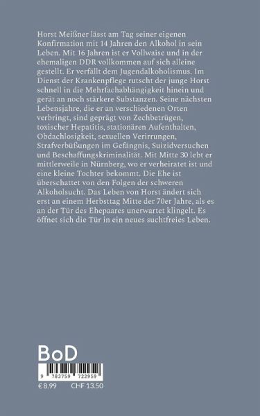 Horst Meißner lässt am Tag seiner eigenen Konfirmation mit 14 Jahren den Alkohol in sein Leben. Mit 16 Jahren ist er Vollwaise und in der ehemaligen DDR vollkommen auf sich alleine gestellt. Er verfällt dem Jugendalkoholismus. Im Dienst der Krankenpflege rutscht der junge Horst schnell in die Mehrfachabhängigkeit hinein und gerät an noch stärkere Substanzen. Seine nächsten Lebensjahre, die er an verschiedenen Orten verbringt, sind geprägt von Zechbetrügen, toxischer Hepatitis, stationären Aufenthalten, Obdachlosigkeit, sexuellen Verirrungen, Strafverbüßungen im Gefängnis, Suizidversuchen und Beschaffungskriminalität. Mit Mitte 30 lebt er mittlerweile in Nürnberg, wo er verheiratet ist und eine kleine Tochter bekommt. Die Ehe ist überschattet von den Folgen der schweren Alkoholsucht. Das Leben von Horst ändert sich erst an einem Herbsttag Mitte der 70er Jahre, als es an der Tür des Ehepaares unerwartet klingelt. Es öffnet sich die Tür in ein neues suchtfreies Leben.