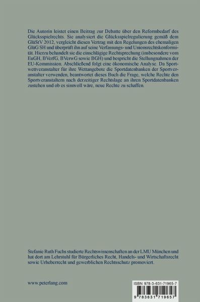Die Autorin leistet einen Beitrag zur Debatte über den Reformbedarf des Glücksspielrechts. Sie analysiert die Glücksspielregulierung gemäß dem GlüStV 2012, vergleicht diesen Vertrag mit den Regelungen des ehemaligen GlüG SH und überprüft ihn auf seine Verfassungs- und Unionsrechtskonformität. Hierzu behandelt sie die einschlägige Rechtsprechung (insbesondere vom EuGH, BVerfG, BVerwG sowie BGH) und bespricht die Stellungnahmen der EU-Kommission. Abschließend folgt eine ökonomische Analyse. Da Sportwettveranstalter für ihre Wettangebote die Sportdatenbanken der Sportveranstalter verwenden, beantwortet dieses Buch die Frage, welche Rechte den Sportveranstaltern nach derzeitiger Rechtslage an ihren Sportdatenbanken zustehen und ob es sinnvoll wäre, neue Rechte zu schaffen.