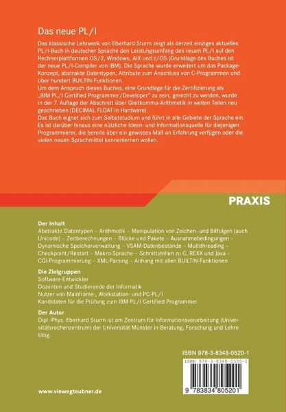 Das klassische Lehrwerk von Eberhard Sturm zeigt als derzeit einziges aktuelles PL/I-Buch in deutscher Sprache den Leistungsumfang des neuen PL/I auf den Rechnerplattformen OS/2, Windows, AIX und z/OS (Grundlage des Buches ist der neue PL/I-Compiler von IBM). Die Sprache wurde erweitert um das Package-Konzept, abstrakte Datentypen, Attribute zum Anschluss von C-Programmen und über 100 BUILTIN-Funktionen.