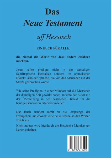 Das Neue Testamentuff HessischEIN BUCH FÜR ALLE,die einmal die Worte von Jesu anders erfahren möchten.Jesus selbst predigte nicht in der damaligen Schriftsprache Hebräisch sondern im aramäischen Dialekt, also der Sprache, die von den Menschen auf der Straße gesprochen wurde.Wie seine Predigten in einer Mundart auf die Menschen der damaligen Zeit gewirkt haben, möchte der Autor mit der Übersetzung in den hessischen Dialekt für die heutige Generation erfahrbar machen. Das Buch erinnert somit an die Ursprünge der Evangelien und erweckt eine neue Freude an den Worten von Jesus. Nicht zuletzt wird hierdurch die Hessische Mundart am Leben gehalten.