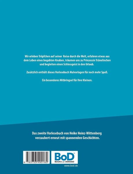 Wir erleben Tröpfchen auf seiner Reise durch die Welt, erfahren etwas aus dem Leben eines begabten Knaben, träumen uns zu Prinzessin Tränelinchen und begleiten einen Schlossgeist in den Urlaub. Zusätzlich enthält dieses Vorlesebuch Malvorlagen für noch mehr Spaß.Ein kleines, aber besonderes Mitbringsel für Ihre Kleinen.