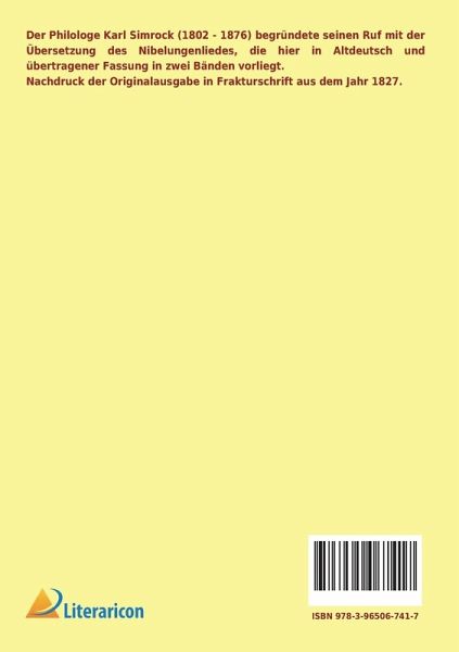 Der Philologe Karl Simrock (1802 - 1876) begründete seinen Ruf mit der Übersetzung des Nibelungenliedes, die hier in Altdeutsch und übertragener Fassung in zwei Bänden vorliegt. Nachdruck der Originalausgabe in Frakturschrift aus dem Jahr 1827.
