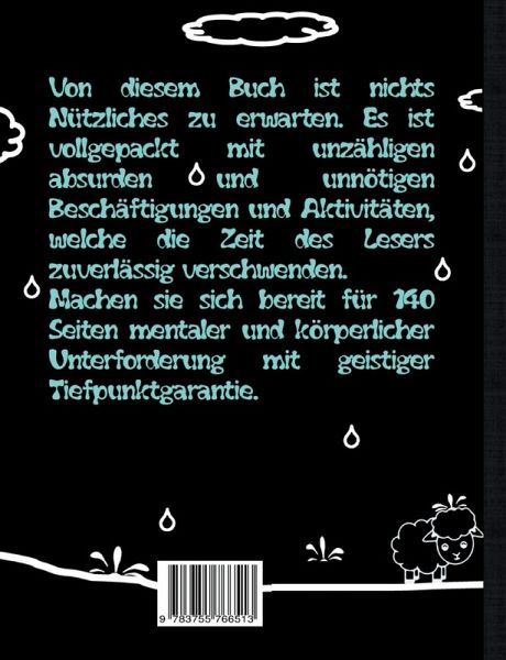 Von diesem Buch ist nichts Nützliches zu erwarten. Es ist vollgepackt mit unzähligen absurden und unnötigen Beschäftigungen und Aktivitäten, welche die Zeit des Lesers zuverlässig verschwenden. Machen sie sich bereit für 140 Seiten mentaler und körperlicher Unterforderung mit geistiger Tiefpunktgarantie. Ebenfalls von diesem Autor: DAS SINNLOSE BUCH - absurde Witze und Rätsel DAS GEGRILLTE BUCH - Witze und Cartoons zum Thema Grillen
