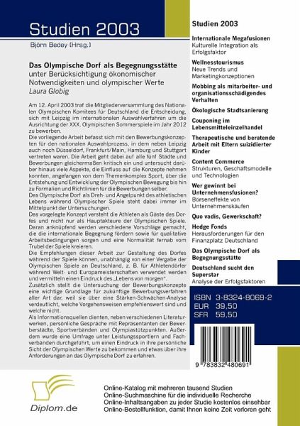 Die vorliegende Arbeit befasst sich mit den Bewerbungskonzepten für den nationalen Auswahlprozess, in dem neben Leipzig auch noch Düsseldorf, Frankfurt/Main, Hamburg und Stuttgart vertreten waren. Die Arbeit geht dabei auf alle fünf Städte und Bewerbungen gleichermaßen kritisch ein und untersucht darüber hinaus viele Aspekte, die Einfluss auf die Konzepte nehmen konnten, angefangen von dem Themenkomplex Sport, über die Entstehung und Entwicklung der Olympischen Bewegung bis hin zu Formalien und Richtlinien für die Bewerbungen selber.