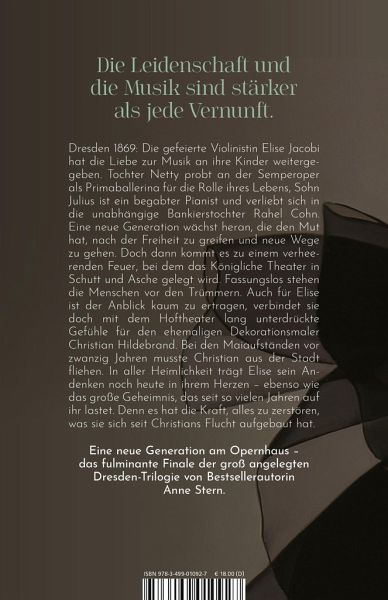 Dresden 1869: Die gefeierte Violinistin Elise Jacobi hat die Liebe zur Musik an ihre Kinder weitergegeben. Tochter Netty probt an der Semperoper als Primaballerina für die Rolle ihres Lebens, Sohn Julius ist ein begabter Pianist und verliebt sich in die unabhängige Bankierstochter Rahel Cohn. Eine neue Generation wächst heran, die den Mut hat, nach der Freiheit zu greifen und neue Wege zu gehen. Doch dann kommt es zu einem verheerenden Feuer, bei dem das Königliche Theater in Schutt und Asche gelegt wird. Fassungslos stehen die Menschen vor den Trümmern. Auch für Elise ist der Anblick kaum zu ertragen, verbindet sie doch mit dem Hoftheater lang unterdrückte Gefühle für den ehemaligen Dekorationsmaler Christian Hildebrand. Bei den Maiaufstände vor zwanzig Jahren musste Christian aus der Stadt fliehen. In aller Heimlichkeit trägt Elise sein Andenken noch heute in ihrem Herzen - ebenso wie das große Geheimnis,das seit so vielen Jahren auf ihr lastet. Denn es hat die Kraft, alles zu zerstören, was sie sich seit Christians Flucht aufgebaut hat.