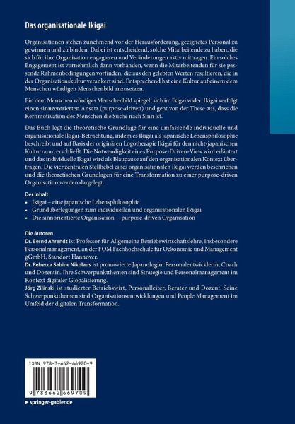 Das Buch legt die theoretische Grundlage für eine umfassende individuelle und organisationale Ikigai-Betrachtung, indem es Ikigai als japanische Lebensphilosophie beschreibt und auf Basis der originären Logotherapie Ikigai für den nicht-japanischen Kulturraum erschließt. Die Notwendigkeit eines Purpose-Driven-View wird erläutert und das individuelle Ikigai wird als Blaupause auf den organisationalen Kontext übertragen. Die vier zentralen Stellhebel eines organisationalen Ikigai werden beschrieben und die theoretischen Grundlagen für eine Transformation zu einer purpose-driven Organisation werden dargelegt.