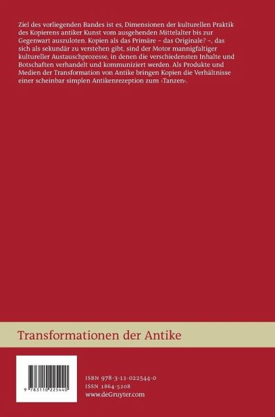 Probleme der Kopien antiker Kunst in nachantiken Epochen werden in diesem Band in Archäologie und Kunstgeschichte im Einzelfall und am Einzelbeispiel besprochen. Begriffe wie Adaption, Anverwandlung, Imitation, Kopie, Nachahmung, Nachbildung oder Reproduktion bevölkern die Literatur in ebenso großer Vielfalt wie die Objekte, auf die sie angewendet werden, die Museen und Sammlungen der Welt seit der Frühen Neuzeit. Über das Phänomen neuzeitlicher Kopien hinausgehend werden damit verbundene Themen wie Ergänzung und Rekonstruktion oder aber das Problem des Fragments in den Blick genommen. Im Gegensatz zur Vorstellung der Antikenkopie als fester Größe, die es am antiken Original zu überprüfen gilt, werden die Transformationsprozesse im Vorgang des Kopierens betont.