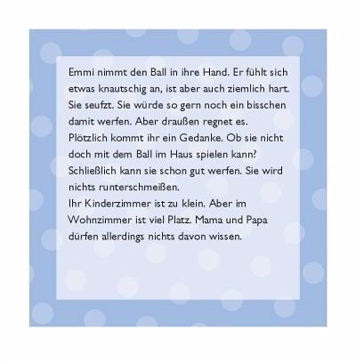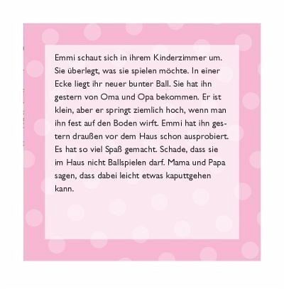 Emmi spielt im Haus mit ihrem Ball, obwohl sie es eigentlich nicht darf. Dann wirft sie mit dem Ball den kleinen Porzellanhasen vom Regal, den sie von der Nachbarin geschenkt bekommen haben. Emmi stellt ihn so zurück, dass man nicht sofort sieht, dass er kaputt ist. Als Papa es trotzdem bemerkt, lügt Emmi. Doch Emmi weiß, dass das nicht richtig ist und spricht mit Jesus darüber. Abends im Bett beichtet sie ihrem Papa, was passiert ist. Papa erklärt Emmi, dass sie als Familie Ostern nicht wegen der Eier oder der Hasen feiern, sondern wegen Jesus. Er ist am Kreuz für unsere Schuld gestorben und wieder auferstanden. Emmi beschließt, ein selbstgemaltes Bild von Jesus dorthin zu stellen, wo der kaputte Hase stand. Schließlich ist Ostern ein Jesusfest.Ein Emmi-Minibuch zum Thema: "Ostern".