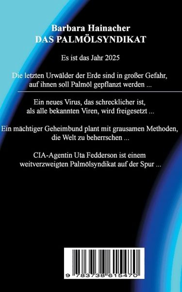 Es ist das Jahr 2025Die letzten Urwälder sind in Gefahr ..., auf ihnen soll Palmöl gepflanzt werdenCIA-Agentin Uta Fedderson ist einem weltweit verzweigten Palmölsyndikat auf der SpurEin mächtiger Geheimbund agiert im Hintergrund mit dem Ziel, die Weltherrschaft an sich zu reißen ...Eine nie dagewesene Eiszeit in EuropaEin neues Virus, das schrecklicher ist, als alle bekannten Viren ...
