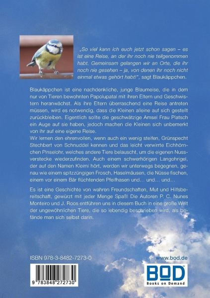 Blaukäppchen ist eine nachdenkliche, junge Blaumeise, die in dem nur von Tieren bewohnten Papolupatal mit ihren Eltern und Geschwistern heranwächst. Als ihre Eltern überraschend eine Reise antreten müssen, wird es notwendig, dass die Kleinen alleine auf sich gestellt zurückbleiben. Eigentlich sollte die geschwätzige Amsel Frau Platsch ein Auge auf sie haben, jedoch machen die Kleinen sich unbemerkt von ihr auf eine eigene Reise. Wir lernen den ehrenvollen, wenn auch ein wenig steifen, Grünspecht Stechbert von Schnuddel kennen und das leicht verwirrte Eichhörnchen Pinselohr, welches andere Tiere belauscht, um die eigenen Nussverstecke wiederzufinden. Auch einem schwerhörigen Langohrigel, der auf den Namen Kleimi hört, werden wir unterwegs begegnen, genau wie einem spitzzüngigen Frosch, Haselmäusen, die Nüsse fischen, einem vor einem Bär flüchtenden Pfeifhasen und... und... und...Es ist eine Geschichte von wahren Freundschaften, Mut und Hilfsbereitschaft, gewürzt mit jeder Menge Spaß! Die Autoren P. C. Nunes Monteiro und J. Roos entführen uns in diesem Buch in eine große Welt der ungewöhnlichen Tiere, die so lebendig beschrieben wird, als befände man sich selbst darin.