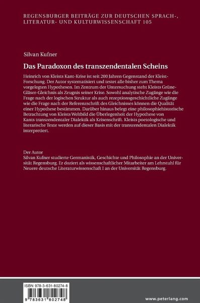 Die Kant-Krise 1801 ist seit 200 Jahren Gegenstand der Kleistforschung. Der Autor systematisiert und testet alle bisher zum Thema vorgelegten Hypothesen. Im Zentrum steht Kleists Grüne-Gläser-Gleichnis als Zeugnis seiner Krise. Sowohl analytische Zugänge wie die Frage nach der logischen Struktur desselben als auch rezeptionsgeschichtliche Zugänge wie die Frage nach der Referenzschrift des Gleichnisses können die Qualität einer Hypothese bestimmen. Philosophiehistorische Untersuchungen zu Kleists Weltbild vor 1801 belegen die Hypothese von Kants transzendentaler Dialektik als Krisenschrift. Andere Hypothesen erweisen sich dieser als unterlegen oder können widerlegt werden. Kleists poetologische und literarische Texte werden auf dieser Basis mit der transzendentalen Dialektik interpretiert.
