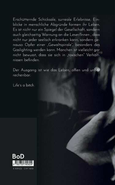 Was ist das perfekte Verbrechen? Ein Verbrechen, das gar nicht wahrgenommen wird. Bis auf das Opfer.Silke Böhm erzählt ihre Geschite, die das Thema Gaslighting beinhaltet, an manchen Stellen mit brutaler Härte die Realität zeigt und von Drogen und Sex, Beziehungsprobleme, zwischenmenschlichen Beziehungen handelt. Sie gibt erschreckende Einblicke in die Psyche und sexuellen Vorlieben von Männern und zeigt die traurige Wahrheit der "vergessenen Seelen" in den Psychiatrien.Dieser autobiografische Roman zieht sich von einer Kleinstadt im Osten Deutschland , über die Upperclass bis in die U.S.A. und den dunklen Teil der Gesellschaft und die staatlichen Psychiatrien. Erschütternde Schicksale, mit Sarkasmus und Zynismus beschrieben und gleichzeitig Warnung, dass nicht nur jeder seelisch erkranken, sondern Opfer einer "Gewaltspirale", besonders des Gaslightings, werden kann. Der Ausgang ist wie das Leben, offen und unberechenbar: Life's a bitch.