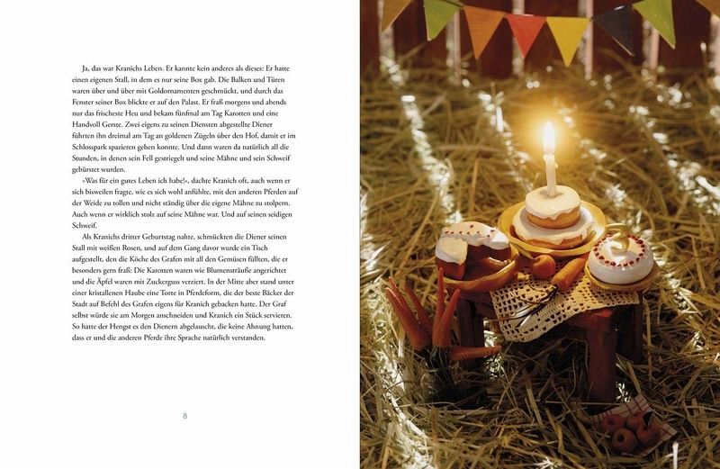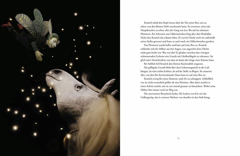 Der wunderschöne Schimmel Kranich führt ein verwöhntes, aber langweiliges Leben am Hof des Grafen - bis zur magischen Nacht vor seinem dritten Geburtstag. In dieser Nacht lernt Kranich den Stalljungen Johan kennen, der die Sprache der Tiere versteht und spricht. Doch noch mehr Wundersames geschieht: Ein Feenwesen flattert in Kranichs Stall und bietet ihm ein Geschenk an, das sein Leben für immer verändern würde. Wie wird sich Kranich entscheiden?