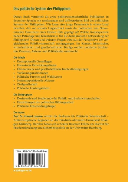 Dieses Buch vermittelt als erste politikwissenschaftliche Publikation in deutscher Sprache ein umfassendes und differenziertes Bild des politischen Systems der Philippinen. Wie kann eine junge Demokratie in einem Land bestehen, das von sozialer Ungleichheit sowie der politischen und ökonomischen Dominanz einer kleinen Elite geprägt ist? Welche Konsequenzen haben Patronage und Klientelismus für die demokratische Entwicklung der Philippinen? Diesen und weiteren Fragen wird aus der Perspektive der vergleichenden Politikwissenschaft nachgegangen. Im Kontext historischer, wirtschaftlicher und gesellschaftlicher Bezüge werden politische Strukturen, Prozesse, Akteure und Politikfelder untersucht.