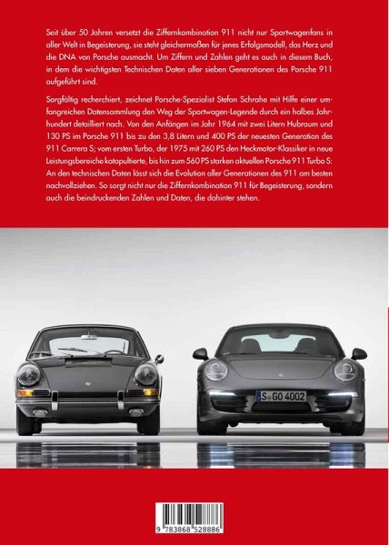 Der neue Leitfaden - herausgegeben vom Fachmagazin »Porsche Fahrer« im praktischen Taschenbuchformat - dokumentiert sämtliche wichtigen technischen Daten aller 911-Generationen aus fünf Jahrzehnten.Seit über 50 Jahren versetzt die Ziffernkombination 911 nicht nur Sportwagenfans in aller Welt in Begeisterung, sie steht gleichermaßen für jenes Erfolgsmodell, das Herz und die DNA von Porsche ausmacht. Um Ziffern und Zahlen geht es auch in diesem Buch, in dem die wichtigsten technischen Daten aller sieben Generationen des Porsche 911 aufgeführt sind.Sorgfältig recherchiert zeichnet Porsche-Spezialist Stefan Schrahe mit Hilfe einer umfangreichen Datensammlung den Weg der Sportwagen-Legende durch ein halbes Jahrhundert nach. Von den Anfängen im Jahr 1964 mit zwei Litern Hubraum und 130 PS im Porsche 911 bis zu den 3,8 Litern und 400 PS der neuesten Generation des 911 Carrera S; vom ersten Turbo, der 1975 mit 260 PS den Heckmotor-Klassiker in neue Leistungsbereiche katapultierte, bis hin zum 560 PS starken aktuellen Porsche 911 Turbo S: An den technischen Daten lässt sich die Evolution aller Generationen des 911 am besten nachvollziehen. So sorgt nicht nur die Ziffernkombination 911 für Begeisterung, sondern auch die beeindruckenden Zahlen und Daten, die dahinter stehen.