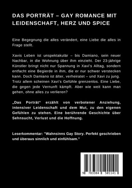 Das Porträt - gay romance mit Leidenschaft, herz und spiceEine Begegnung die alles verändert, eine Liebe die alles in Frage stellt. Xavis Leben ist unspektakulär - bis Damiano, sein neuer Nachbar, in die Wohnung über ihm einzieht. Der 23-jährige Künstler bringt nicht nur Spannung in Xavi's Alltag, sondern entfacht eine Begierde in ihm, die er nur schwer verstecken kann. Doch Damiano ist älter, verheiratet - und Xavi zu jung.Trotz allem scheinen Xavi's Gefühle grenzenlos. Eine Liebe, die gegen jede Vernunft kämpft. Aber wie weit kann man gehen, ohne alles zu verlieren?"Das Porträt" erzählt von verbotener Anziehung, intensiver Leidenschaft und dem Mut, zu den eigenen Gefühlen zu stehen. Eine berührende Geschichte über Sehnsucht, Verlust und die Hoffnung.