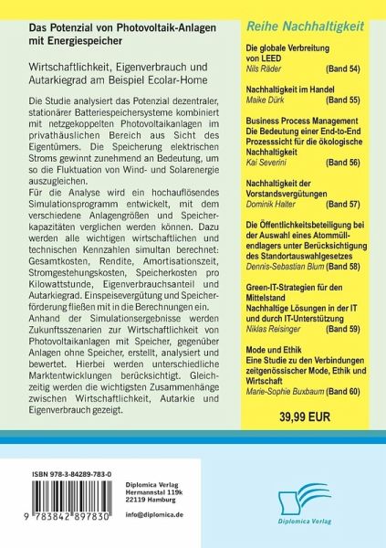 Die Studie analysiert das Potenzial dezentraler stationärer Batteriespeichersysteme kombiniert mit netzgekoppelten Photovoltaikanlagen im privathäuslichen Bereich aus Sicht des Eigentümers. Die Speicherung elektrischen Stroms gewinnt zunehmend an Bedeutung, um so die Fluktuation von Wind- und Solarenergie auszugleichen.