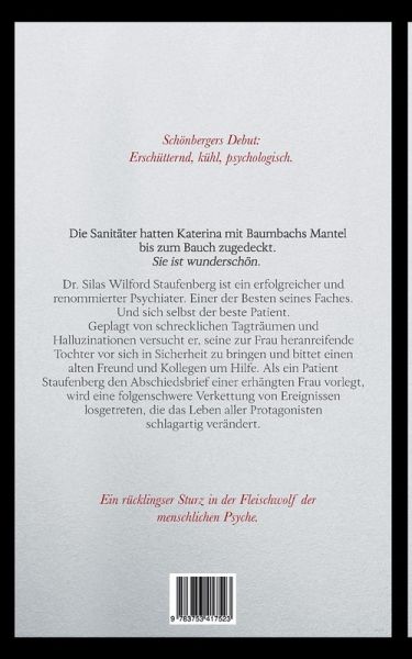 Doktor Silas Wilford Staufenberg ist ein erfolgreicher und renommierter Psychiater, einer der besten seines Faches. Und sich selbst der beste Patient. Geplagt von schrecklichen Tagträumen und Halluzinationen versucht er, seine zur Frau heranreifende Tochter vor sich in Sicherheit zu bringen, er fürchtet die Kontrolle über sich zu verlieren, und bittet einen alten Freund und Kollegen um Rat. Als ein Patient Staufenberg den Abschiedsbrief einer erhängten Frau vorlegt, wird eine folgenschwere Verkettung von Ereignissen losgetreten, die das Leben aller Protagonisten schlagartig verändert.Schönbergers Debut neu aufgelegt: Erschütternd, kühl, psychologisch.Die neu überarbeitete Fassung dehnt den Handlungsstrang weiter aus, beleuchtet weitere Hintergründe und bekommt einen neuen Schluss, der noch einmal alles verändert.
