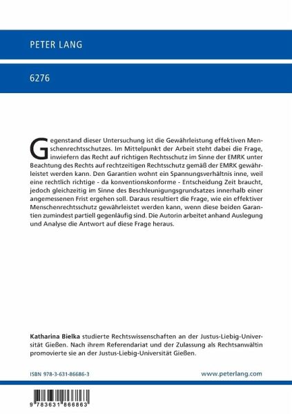 Gegenstand dieser Untersuchung ist die Gewährleistung effektiven Menschenrechtsschutzes. Im Mittelpunkt der Arbeit steht dabei die Frage, inwiefern das Recht auf richtigen Rechtsschutz im Sinne der EMRK unter Beachtung des Rechts auf rechtzeitigen Rechtsschutz gemäß der EMRK gewährleistet werden kann. Den Garantien wohnt ein Spannungsverhältnis inne, weil eine rechtlich richtige - da konventionskonforme Entscheidung - Zeit braucht, jedoch gleichzeitig im Sinne des Beschleunigungsgrundsatzes innerhalb einer angemessenen Frist ergehen soll. Daraus resultiert die Frage, wie ein effektiver Menschenrechtsschutz gewährleistet werden kann, wenn diese beiden Garantien zumindest partiell gegenläufig sind. Die Autorin arbeitet anhand Auslegung und Analyse die Antwort auf diese Frage heraus.