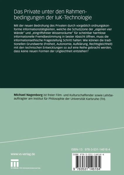neue< Bedrohung des Privaten.- II. Ziel der Untersuchung.- III. Zum gewählten Ansatz.- IV. Zur Einordnung der Untersuchung in die "Informationsethik".- V. Abgrenzung zu weiteren Problemen.- VI. Zur verwendeten Literatur.- VII. Gang der Untersuchung.- B. Definitionen des Privaten.- I. Rössler: Drei Bedeutungsdimensionen des Privaten.- II. Tavani: Typologie der Theorien des Privaten.- III. Zusammenfassende Kritik an der Typologie von Tavani.- IV. Normative Aspekte des Privaten.- V. Konsensansatz des Privaten.- VI. Weitere Typologien.- C. Tabu, Geheimhaltung und Anonymität.- I. Einleitung.- II. Tabu.- III. Geheimnis und Geheimhaltung.- IV. Anonymität.- D. Die liberale Auffassung des Privaten.- I. Der liberal-demokratische Rahmen.- II. Das Private in Berlins Aufsatz "Zwei Freiheitsbegriffe".- III. Exkurs: Das Private als "Hort der Natur".- IV. Zur Kritik an dem liberalen Modell des Privaten.- E. Autonomie und Privatheit.- I. Vorbemerkung.- II. Der instrumentelle Wert des Privaten.- III. Privatheit und Autonomie.- F. Zu einer neo-klassischen Privatheitsauffassung.- I. Einleitung.- II. Die antike Vorstellung von Privatheit und Öffentlichkeit.- III. Privatheit und Öffentlichkeit im Zeitalter der Aufklärung.- IV. Die klassische Dichotomie von Privatheit und Öffentlichkeit.- V. Die Zustimmung zu den allgemeinen Regeln.- VI. Vom Verlust der Öffentlichkeit.- VII. Der Verlust der Bürgerlichkeit.- VIII. Die neo-klassische Privatheitsauffassung: Zusammenfassung.- G. Verlusterfahrungen des Privaten.- I. Einleitung.- II. Neue Produktionsmöglichkeiten.- III. Exkurs: Ins Universum der technischen Bilder.- IV. Neue Distributionsmöglichkeiten.- V. Telekommunikation.- VI. Datenbanken.- VII. Good bye, Big Brother! Hello, little Sisters!.- VIII.Privatheit unter den Rahmenbedingungen der IuK-Technologien.- IX. Der Lösungsvorschlag von Warren und Brandeis (1890).- H. Unsere panoptische Gesellschaft.- I. Überleitung.- II. Foucault und die Medienethik.- III. Das Foucaultsche Modell der panoptischen Gesellschaft.- IV. Gleichheit in der panoptischen Gesellschaft.- V. Zur Kritik am Panopticon.- VI. Die Ethik der Überwachung.- VII. Interaktive Medien als panoptische Strukturen.- VIII. Der Widerstand gegen panoptische Strukturen.- I. Konsens und Privatheit.- I. Der kommerzielle Wert des Privaten.- II. Das Recht auf die optimale Vermarktung seiner Selbst.- III. Lessig: Privacy as Property.- IV. Exkurs: Der Verlust der Bedeutungslosigkeit.- V. Lessig: Privacy as Property - Fortsetzung.- VI. Privatheit und die Ökonomie der Angst.- VII. Die gesellschaftliche Dimension des Privaten.- J. Fazit.- I. Zusammenfassung der wesentlichen Ergebnisse.- II. Elemente einer Kultur des Privaten.- III. Schlussanmerkungen.- Personenregister.