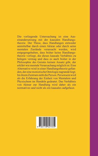 Die vorliegende Untersuchung ist eine Auseinandersetzung mit der kausalen Handlungstheorie. Der These, dass Handlungen entweder unmittelbar durch einen Akteur oder durch seine mentalen Zustände verursacht werden, wird entgegengehalten, dass bisher keine Handlungstheorie vorliegt, die dieses kausale Verhältnis zu belegen vermag und dass es auch bisher in der Philosophie des Geistes keinen Ansatz gibt, der erklärt wie mentale Verursachung möglich ist. Eine Alternative wird in einer Handlungstheorie gefunden, der eine monistische Ontologie zugrunde liegt. Im ihrem Zentrum steht die Person. Personsein wird als die Erfahrung der Einheit von Mentalem und Physischem im Handeln gedeutet. Das Verhältnis von Akteur zur Handlung wird daher als ein normatives und nicht als ein kausales aufgefasst.