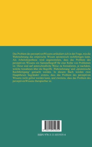 Das Problem des perzeptiven Wissens artikuliert sich in der Frage, wie die Wahrnehmung das empirische Wissen epistemisch rechtfertigen kann. Als Arbeitshypothese wird angenommen, dass das Problem des perzeptiven Wissens ein Sammelbegriff für eine Reihe von Problemen ist. Diese sind auf unterschiedliche Weise zu formulieren, je nachdem, welche Annahmen über die Begriffe 'Wahrnehmung' und 'epistemische Rechtfertigung' gemacht werden. In diesem Buch werden zwei Hauptthesen begründet: erstens, dass das Problem des perzeptiven Wissens nicht gelöst werden kann, und zweitens, dass das Problem des perzeptiven Wissens therapierbar ist.