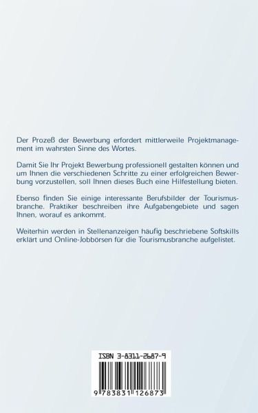 Der Prozeß der Bewerbung erfodert mittlerweile Projektmanagement im wahrsten Sinne des Wortes. Damit Sie Ihr Projekt Bewerbung professionell gestalten können und um Ihnen die verschiedenen Schritte zu einer erfolgreichen Bewerbung vorzustellen, soll Ihnen dieses Buch eine Hilfstellung bieten. Ebenso finden Sie einige interessante Berufsbilder der Tourismusbranche. Praktiker beschreiben ihre Aufgabengebiete und sagen Ihnen, worauf es ankommt. Weiterhin werden in Anforderungen häufig beschriebene Softskills erklärt und Online-Jobbörsen für die Tourismusbranche aufgelistet.