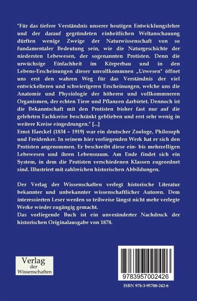 Ernst Haeckel (1834 1919) war ein deutscher Zoologe, Philosoph und Freidenker. In seinem hier vorliegenden Werk hat er sich den Protisten angenommen. Er beschreibt diese ein- bis mehrzelligen Lebewesen und ihren Lebensraum. Am Ende findet sich ein System, in dem die Protisten verschiedenen Klassen zugeordnet sind. Illustriert mit zahlreichen historischen Abbildungen.