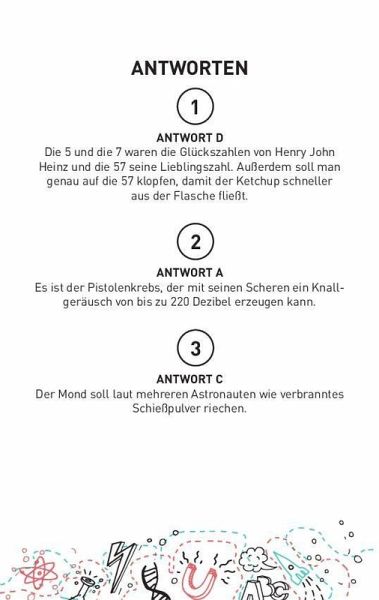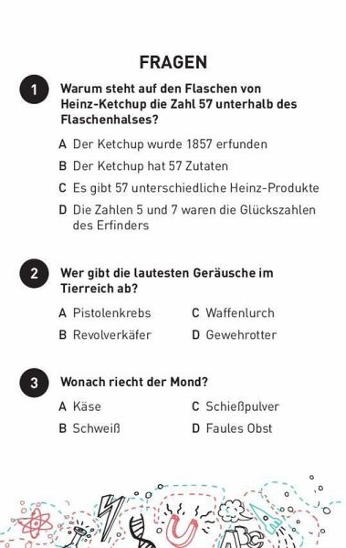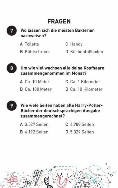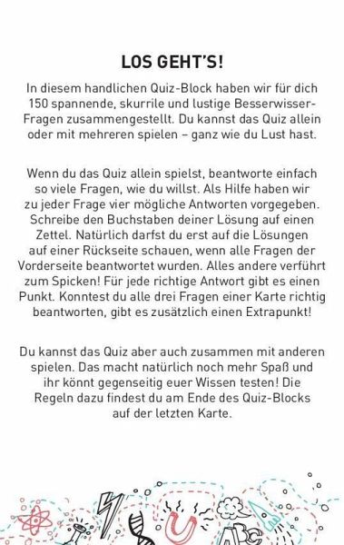 Woher kommt eigentlich die Redewendung "Tdie Arschkarte ziehen"? Wonach riecht der Mond und um wie viel wachsen alle deine Haare zusammengenommen im Monat? Teste dein Wissen mit 150 kniffligen Fragen und finde heraus, wer in deiner Familie oder in deinem Freundeskreis der wahre Quiz-Meister ist! Egal ob du allein oder gemeinsam mit deiner Familie oder Freunden spielst, dieser handliche Quiz-Block bietet dir spannende Fragen zu Angeber-Wissen und Skurrilem. Perfekt für Kinder ab 10 Jahren und Erwachsene, die Spaß am Rätseln haben. Wer kennt die richtige Antwort? Wer mussraten? Werde mit uns zum Quizchampion und lerne ganz nebenbei noch verblüffende und lustige Fakten dazu. Denn im übersichtlichen Lösungsteil findest du nicht nur die richtigen Antworten, sondern auch spannende Hintergrundinformationen. Entdecke es jetzt und bringe den Spielspaß in dein Zuhause!