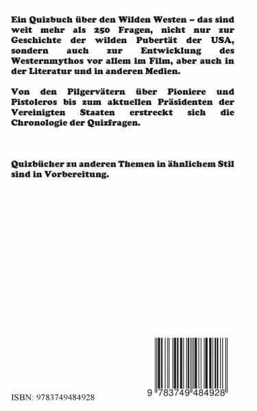 Ein Quizbuch über den Wilden Westen - das sind weit mehr als 250 Fragen, nicht nur zur Geschichte der wilden Pubertät der USA, sondern auch zur Entwicklung des Westernmythos vor allem im Film, aber auch in der Literatur und in anderen Medien.Von den Pilgervätern über Pioniere und Pistoleros bis zum aktuellen Präsidenten der Vereinigten Staaten erstreckt sich die Chronologie der Quizfragen.