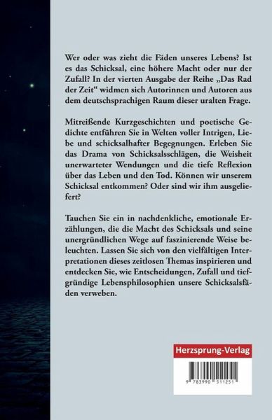 Wer oder was zieht die Fäden unseres Lebens? Ist es das Schicksal, eine höhere Macht oder nur der Zufall? In der vierten Ausgabe der erfolgreichen Reihe "Das Rad der Zeit" widmen sich Autorinnen und Autoren aus dem deutschsprachigen Raum dieser uralten Frage.Mitreißende kurze Geschichten und poetische Gedichte über das Schicksal entführen Sie in Welten voller Intrigen, Liebe und schicksalhafter Begegnungen. Erleben Sie das Drama von Schicksalsschlägen, die Weisheit unerwarteter Wendungen und die tiefe Reflexion über das Leben und den Tod. Können wir unserem Schicksal entkommen? Oder sind wir ihm ausgeliefert?Dieses Buch ist mehr als nur eine Sammlung von Erzählungen - es ist ein Werk, das sich an Erwachsene richtet, die nach Büchern über das Schicksal suchen, um die großen Fragen des Lebens zu erforschen. Es bietet spirituelle Überlegungen über das Schicksal ebenso wie philosophische Überlegungen, die dazu einladen, über die Unvermeidbarkeit unseres Lebenswegs nachzudenken.DiesesBuch ist das perfekte Geschenk für Menschen, die sich für das Schicksal interessieren. Lassen Sie sich von den vielfältigen Interpretationen dieses zeitlosen Themas inspirieren und entdecken Sie, wie Entscheidungen, Zufall und tiefgründige Lebensphilosophien unsere Schicksalsfäden verweben. Tauchen Sie ein in eine Welt, in der das Schicksal die Macht hat, unser Leben auf faszinierende Weise zu lenken.