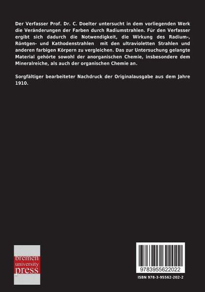 Der Verfasser Prof. Dr. C. Doelter untersucht in dem vorliegenden Werk die Veränderungen der Farben durch Radiumstrahlen. Für den Verfasser ergibt sich dadurch die Notwendigkeit, die Wirkung des Radium-, Röntgen- und Kathodenstrahlen mit den ultravioletten Strahlen und anderen farbigen Körpern zu vergleichen. Das zur Untersuchung gelangte Material gehörte sowohl der anorganischen Chemie, insbesondere dem Mineralreiche, als auch der organischen Chemie an.