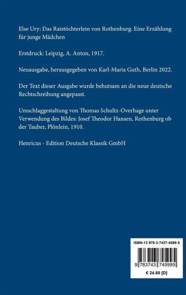 Else Ury: Das Ratstöchterlein von Rothenburg. Eine Erzählung für junge MädchenErstdruck: Leipzig, A. Anton, 1917.Neuausgabe, herausgegeben von Karl-Maria Guth, Berlin 2023.Der Text dieser Ausgabe wurde behutsam an die neue deutsche Rechtschreibung angepasst.Umschlagabbildung: Josef Theodor Hansen, Rothenburg ob der Tauber, Plönlein, 1910Gesetzt aus der Minion Pro, 11 pt.Die Sammlung Hofenberg erscheint im Verlag Henricus - Edition Deutsche Klassik GmbH, Berlin