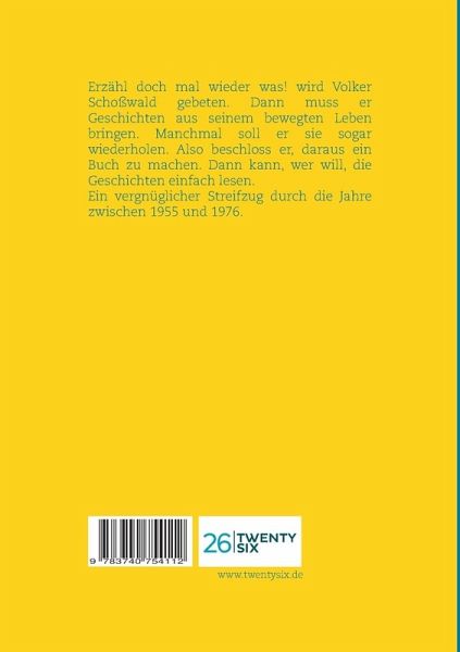 Erzähl doch mal wieder was! wird Volker Schoßwald gebeten. Dann muss er Geschichten aus seinem bewegten Leben bringen. Manchmal soll er sie sogar wiederholen. Also beschloss er, daraus ein Buch zu machen. Dann kann, wer will, die Geschichten einfach lesen. Ein vergnüglicher Streifzug durch die Jahre zwischen 1955 und 1976.