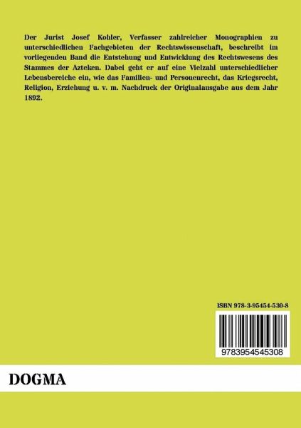Der Jurist Josef Kohler, Verfasser zahlreicher Monographien zu unterschiedlichen Fachgebieten der Rechtswissenschaft, beschreibt im vorliegenden Band die Entstehung und Entwicklung des Rechtswesens des Stammes der Azteken. Dabei geht er auf eine Vielzahl unterschiedlicher Lebensbereiche ein, wie das Familien- und Personenrecht, das Kriegsrecht, Religion, Erziehung u. v. m. Nachdruck der Originalausgabe aus dem Jahr 1892.