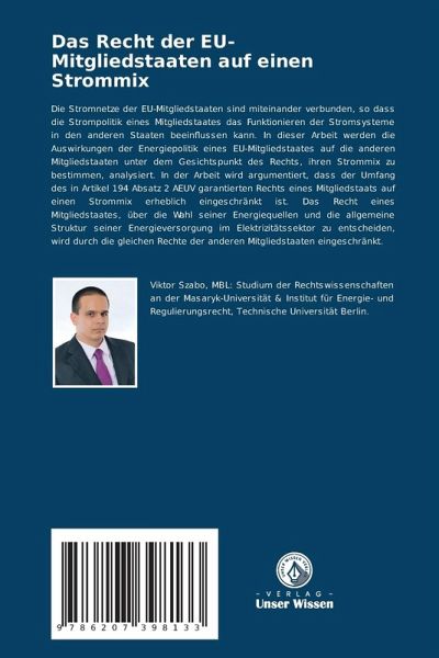 Die Stromnetze der EU-Mitgliedstaaten sind miteinander verbunden, so dass die Strompolitik eines Mitgliedstaates das Funktionieren der Stromsysteme in den anderen Staaten beeinflussen kann. In dieser Arbeit werden die Auswirkungen der Energiepolitik eines EU-Mitgliedstaates auf die anderen Mitgliedstaaten unter dem Gesichtspunkt des Rechts, ihren Strommix zu bestimmen, analysiert. In der Arbeit wird argumentiert, dass der Umfang des in Artikel 194 Absatz 2 AEUV garantierten Rechts eines Mitgliedstaats auf einen Strommix erheblich eingeschränkt ist. Das Recht eines Mitgliedstaates, über die Wahl seiner Energiequellen und die allgemeine Struktur seiner Energieversorgung im Elektrizitätssektor zu entscheiden, wird durch die gleichen Rechte der anderen Mitgliedstaaten eingeschränkt.