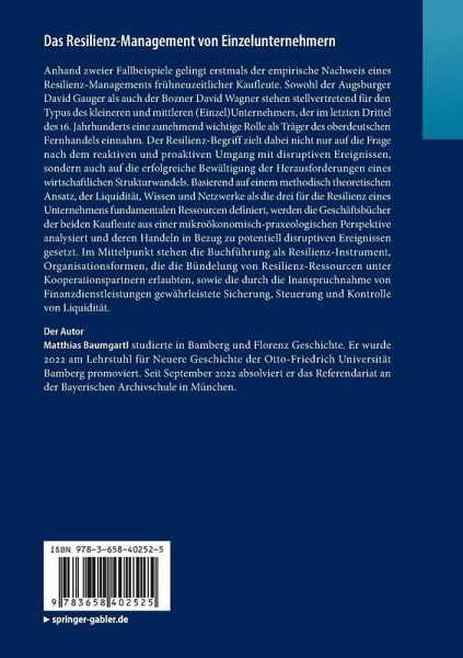 Anhand zweier Fallbeispiele gelingt erstmals der empirische Nachweis eines Resilienz-Managements frühneuzeitlicher Kaufleute. Sowohl der Augsburger David Gauger als auch der Bozner David Wagner stehen stellvertretend für den Typus des kleineren und mittleren (Einzel-)Unternehmers, der im letzten Drittel des 16. Jahrhunderts eine zunehmend wichtige Rolle als Träger des oberdeutschen Fernhandels einnahm. Der Resilienz-Begriff zielt dabei nicht nur auf die Frage nach dem reaktiven und proaktiven Umgang mit disruptiven Ereignissen, sondern auch auf die erfolgreiche Bewältigung der Herausforderungen eines wirtschaftlichen Strukturwandels. Basierend auf einem methodisch-theoretischen Ansatz, der Liquidität, Wissen und Netzwerke als die drei für die Resilienz eines Unternehmens fundamentalen Ressourcen definiert, werden die Geschäftsbücher der beiden Kaufleute aus einer mikroökonomisch-praxeologischen Perspektive analysiert und deren Handeln in Bezug zu potentiell disruptiven Ereignissen gesetzt. Im Mittelpunkt stehen die Buchführung als Resilienz-Instrument, Organisationsformen, die die Bündelung von Resilienz-Ressourcen unter Kooperationspartnern erlaubten, sowie die durch die Inanspruchnahme von Finanzdienstleistungen gewährleistete Sicherung, Steuerung und Kontrolle von Liquidität.