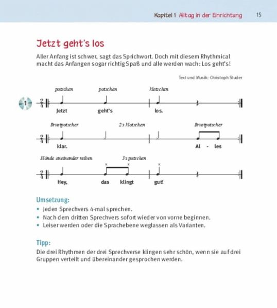 Rhythmicals - das sind superkurze und supereinfache Verse, bei denen der Sprechtext durch Gestik, Mimik, Bewegungen und Bodypercussion unterstützt wird. Es ist also voller Körpereinsatz gefragt! Die spielerische Verknüpfung von Sprach- und Bewegungsebene fördert die motorische Koordination und das Rhythmusempfinden. Rhythmicals machen Kindern, Pädagog:innen und Erzieher:innen gleichermaßen Spaß und eignen sich perfekt für die Sprachförderung in Kita und Grundschule. Einfache Umsetzung: kein Notenlesen und wenig Vorbereitung nötig Rhythmische Verse zu vielen Anlässen: Kita-Alltag, Feste, Natur und Tiere... Spaß und Bewegung, abgestimmt auf Kinder von 3 bis 8 Jahren Verknüpfung von Sprach- und Bewegungsebene: Ganzheitliches Musik- und Körpererleben Sprache und Koordination fördern: schnelle Erfolgserlebnisseauch für Anfänger Downloadcode für Zusatzmaterial: Videos und MP3-Versionen der Lieder und Reime Der Rhythmus, bei dem jeder mit muss: Sprechverse in Bewegung