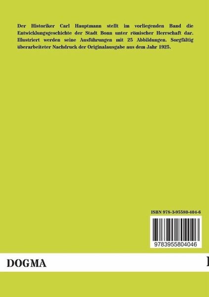 Der Historiker Carl Hauptmann stellt im vorliegenden Band die Entwicklungsgeschichte der Stadt Bonn unter römischer Herrschaft dar. Illustriert werden seine Ausführungen mit 25 Abbildungen. Sorgfältig überarbeiteter Nachdruck der Originalausgabe aus dem Jahr 1925.
