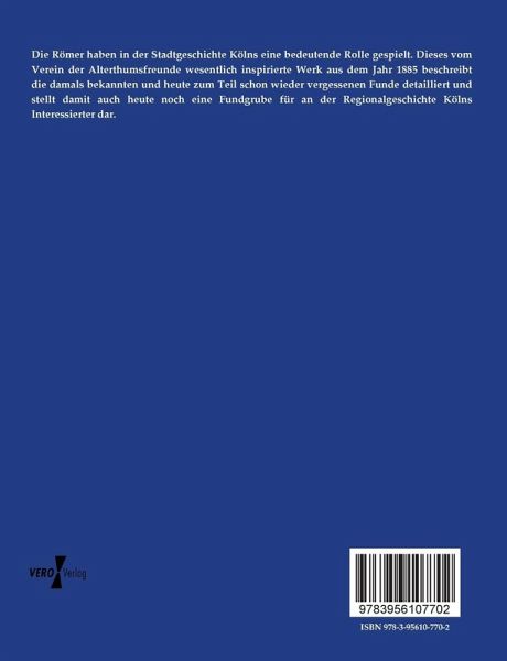 Die Römer haben in der Stadtgeschichte Kölns eine bedeutende Rolle gespielt. Dieses vom Verein der Alterthumsfreunde wesentlich inspirierte Werk aus dem Jahr 1885 beschreibt die damals bekannten und heute zum Teil schon wieder vergessenen Funde detailliert und stellt damit auch heute noch eine Fundgrube für an der Regionalgeschichte Kölns Interessierter dar.