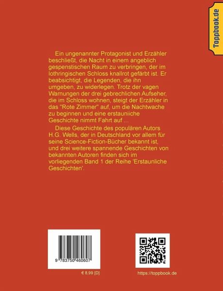 Ein ungenannter Protagonist und Erzähler beschließt, die Nacht in einem angeblich gespenstischen Raum zu verbringen, der im lothringischen Schloss knallrot gefärbt ist. Er beabsichtigt, die Legenden, die ihn umgeben, zu widerlegen. Trotz der vagen Warnungen der drei gebrechlichen Aufseher, die im Schloss wohnen, steigt der Erzähler in das "Rote Zimmer" auf, um die Nachtwache zu beginnen und eine erstauniiche Geschichte nimmt Fahrt auf ...Diese Geschichte des populären Autors H.G. Wells, der in Deutschland vor allem für seine Science-Fiction-Bücher bekannt ist, und drei weitere spannende Geschichten von bekannten Autoren finden sich im vorliegenden Band 1 der Reihe 'Erstaunliche Geschichten'.Hier liegt nun die zweite überarbeitete und verbesserte Auflage vor.