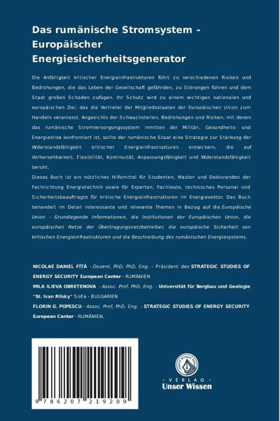 Die Anfälligkeit kritischer Energieinfrastrukturen führt zu verschiedenen Risiken und Bedrohungen, die das Leben der Gesellschaft gefährden, zu Störungen führen und dem Staat großen Schaden zufügen. Ihr Schutz wird zu einem wichtigen nationalen und europäischen Ziel, das die Vertreter der Mitgliedsstaaten der Europäischen Union zum Handeln veranlasst. Angesichts der Schwachstellen, Bedrohungen und Risiken, mit denen das rumänische Stromversorgungssystem inmitten der Militär-, Gesundheits- und Energiekrise konfrontiert ist, sollte der rumänische Staat eine Strategie zur Stärkung der Widerstandsfähigkeit kritischer Energieinfrastrukturen entwickeln, die auf Vorhersehbarkeit, Flexibilität, Kontinuität, Anpassungsfähigkeit und Widerstandsfähigkeit beruht.Dieses Buch ist ein nützliches Hilfsmittel für Studenten, Master- und Doktoranden der Fachrichtung Energietechnik sowie für Experten, Fachleute, technisches Personal und Sicherheitsbeauftragte für kritische Energieinfrastrukturen im Energiesektor. Das Buch behandelt im Detail interessante und relevante Themen in Bezug auf die Europäische Union - Grundlegende Informationen, die Institutionen der Europäischen Union, die europäischen Netze der Übertragungsnetzbetreiber, die europäische Sicherheit von kritischen Energieinfrastrukturen und die Beschreibung des rumänischen Energiesystems.